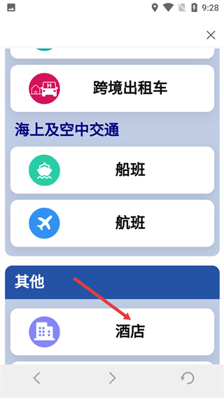 2、在服務(wù)選擇頁面中,點(diǎn)擊“酒店”選項(xiàng),進(jìn)入酒店相關(guān)的查詢與預(yù)訂界面。