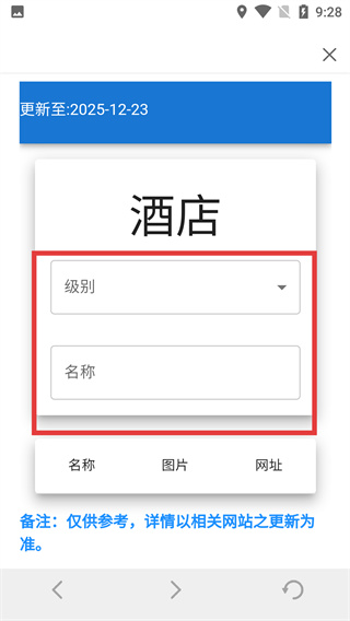 3、進(jìn)入酒店界面后,可通過“級(jí)別”下拉選擇框與“名稱”輸入框,設(shè)置對(duì)應(yīng)的酒店篩選條件。