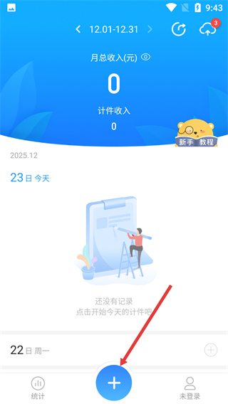 1、進(jìn)入統(tǒng)計頁面后,若顯示“還沒有記錄”提示,點擊底部加號按鈕,可啟動今日計件記錄的添加流程。