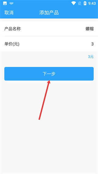 3、在添加產(chǎn)品頁面填好【產(chǎn)品名稱】-【單價(元)】后,點擊【下一步】按鈕推進(jìn)后續(xù)操作。