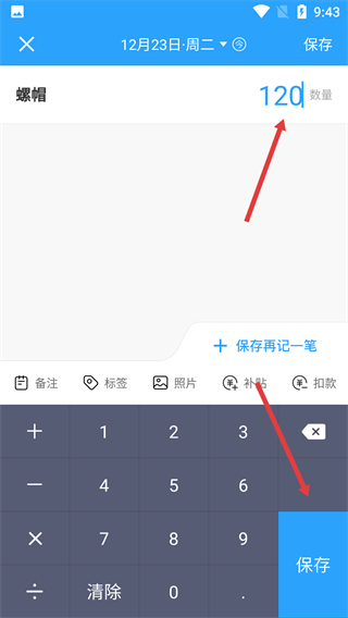 4、在計件記錄頁面輸入【數(shù)量】數(shù)值后,點擊【保存】按鈕,即可完成本次計件記錄的添加操作。