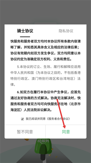 1、閱讀【騎士協(xié)議】-【隱私協(xié)議】后,勾選【我已閱讀并同意《服務(wù)者合作協(xié)議》】,點(diǎn)擊【同意】按鈕繼續(xù)使用服務(wù)。
