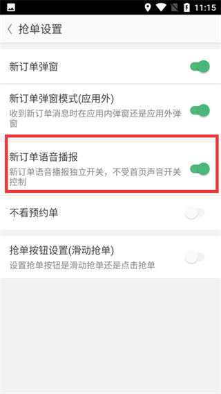 3、在搶單設(shè)置頁(yè)面中,【新訂單語(yǔ)音播報(bào)】開(kāi)關(guān)獨(dú)立控制新訂單語(yǔ)音提醒,不受首頁(yè)聲音開(kāi)關(guān)影響。