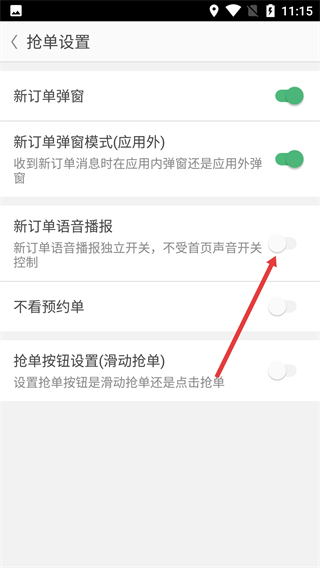 4、在搶單設(shè)置頁(yè)面,點(diǎn)擊【新訂單語(yǔ)音播報(bào)】對(duì)應(yīng)的開(kāi)關(guān),可關(guān)閉該功能的語(yǔ)音提醒。