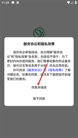 1、打開應(yīng)用后,閱讀【服務(wù)協(xié)議和隱私政策】彈窗內(nèi)容,點(diǎn)擊【同意并接受】按鈕,進(jìn)入應(yīng)用主界面。