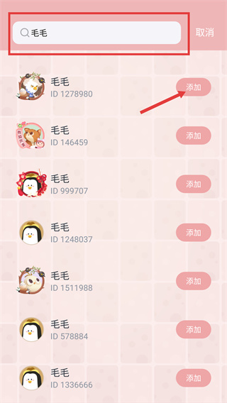 3、在好友搜索界面的輸入框中輸入“毛毛”,執(zhí)行搜索操作,獲取對應(yīng)的用戶列表結(jié)果。