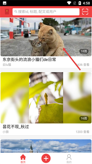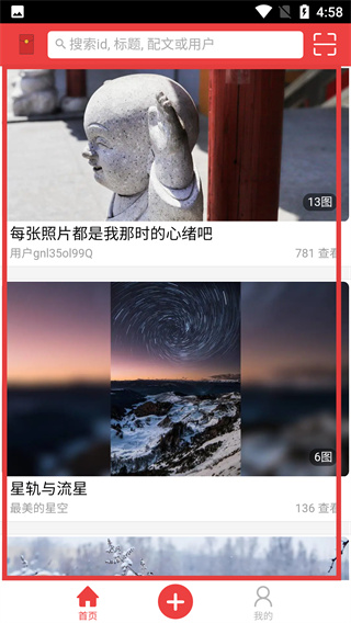 1、進(jìn)入首頁界面,可瀏覽各類主題的圖冊內(nèi)容,查看不同作品的標(biāo)題、發(fā)布用戶及對應(yīng)的查看量數(shù)據(jù)。