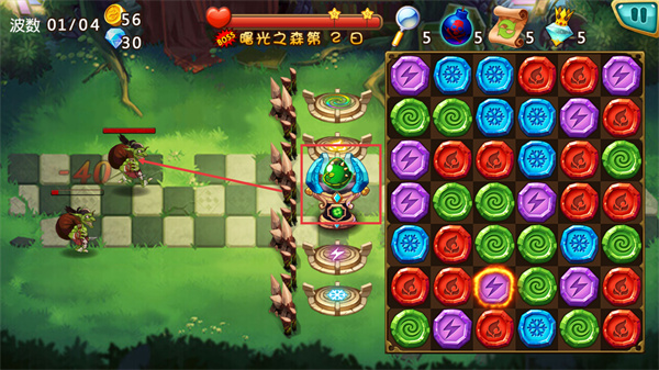 2、在【曙光之森第2日】關(guān)卡中,通過消除對應(yīng)元素寶石,激活中間裝置來攻擊敵方單位,推進(jìn)【01/04】波數(shù)進(jìn)度。