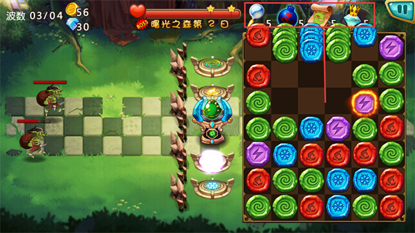 3、關(guān)卡推進(jìn)至【03/04】波數(shù)時(shí),可利用上方道具輔助消除寶石,更快擊敗剩余敵方單位。