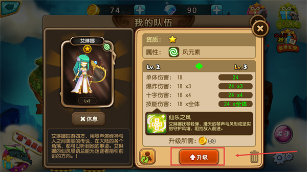4、在隊(duì)伍界面點(diǎn)擊【升級(jí)】按鈕,消耗60金幣可提升【艾琳娜】等級(jí),增強(qiáng)其單體、爆炸等傷害屬性,提升戰(zhàn)力。