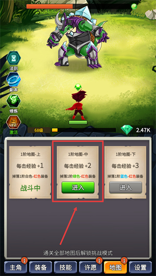 1、選擇【1階地圖-中】進(jìn)入冒險(xiǎn),獲取經(jīng)驗(yàn)與1階綠色-紅色裝備,積累資源提升角色戰(zhàn)斗力。