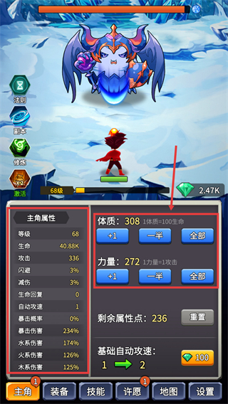 2、根據(jù)路線分配【體質(zhì)】【力量】屬性點(diǎn),水系加體質(zhì)減傷,火系加力量增攻,強(qiáng)化戰(zhàn)斗風(fēng)格。