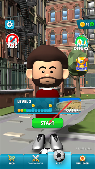 1、點(diǎn)擊【START】按鈕進(jìn)入關(guān)卡,選擇場(chǎng)地開(kāi)始顛球,積累金幣解鎖人物和足球皮膚。