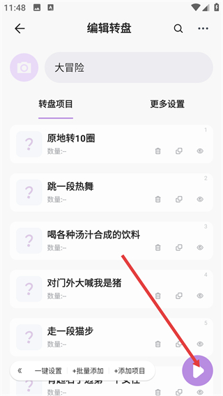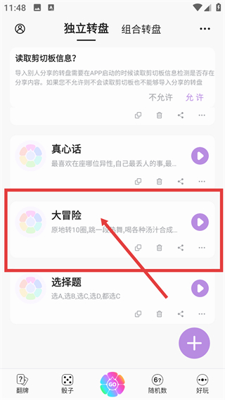 1、選擇界面中的【大冒險(xiǎn)】轉(zhuǎn)盤(pán),可直接使用現(xiàn)成選項(xiàng)做決定,也能點(diǎn)擊進(jìn)入編輯頁(yè)面自定義轉(zhuǎn)盤(pán)內(nèi)的項(xiàng)目?jī)?nèi)容。