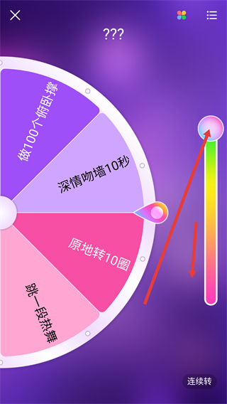 3、點(diǎn)擊播放按鈕后轉(zhuǎn)盤(pán)開(kāi)始轉(zhuǎn)動(dòng),右側(cè)顏色條可調(diào)整視覺(jué)效果,轉(zhuǎn)動(dòng)結(jié)束時(shí)指針指向的選項(xiàng)即為最終決定結(jié)果。