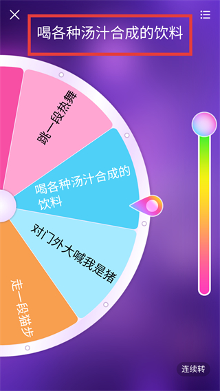 4、轉(zhuǎn)盤(pán)停止轉(zhuǎn)動(dòng)后,頂部會(huì)顯示選中的結(jié)果內(nèi)容,若對(duì)結(jié)果不滿意,可點(diǎn)擊【連續(xù)轉(zhuǎn)】按鈕再次轉(zhuǎn)動(dòng)獲取新結(jié)果。