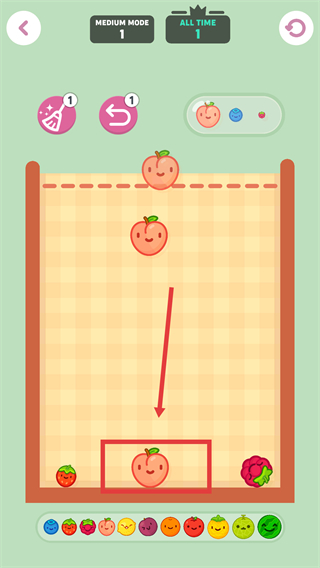 3、游玩時(shí),瞄準(zhǔn)下方同類型桃子的位置,讓上方桃子落下合并,可提升分?jǐn)?shù)并推進(jìn)游戲的進(jìn)度。