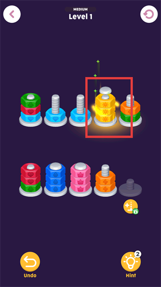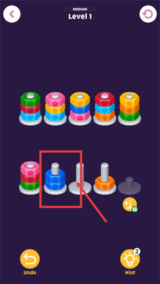 1、進(jìn)入關(guān)卡后觀察下方的柱子,將螺絲移到空柱子上推進(jìn)關(guān)卡進(jìn)度。