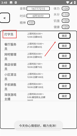 2、選擇【打字員】職業(yè),其上班時間為8:00~12:00、日薪80元,可穩(wěn)定積累初始資金保障生存。