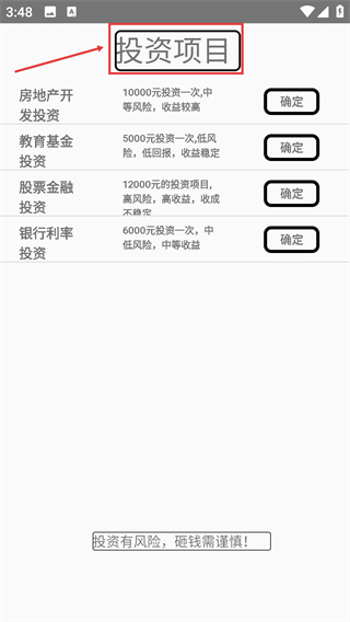 3、進入【投資項目】界面,根據(jù)資金狀況選擇對應項目,低風險項目適合初期積累,需謹慎規(guī)避高風險虧損。