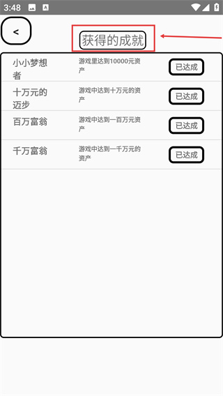 4、查看【獲得的成就】,達成資產目標可解鎖對應獎勵,后續(xù)可依據(jù)成就進度調整資源積累策略。