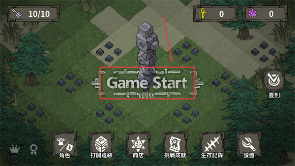 1、點(diǎn)擊【Game-Start】進(jìn)入游戲,先熟悉界面功能,初始鑰匙資源【10/10】可用于后續(xù)解鎖內(nèi)容。