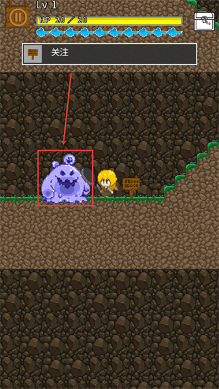2、在【Lv-1】階段遭遇【紫色怪物】時,利用初始武器攻擊,注意保持【HP-20/20】的健康狀態(tài)。